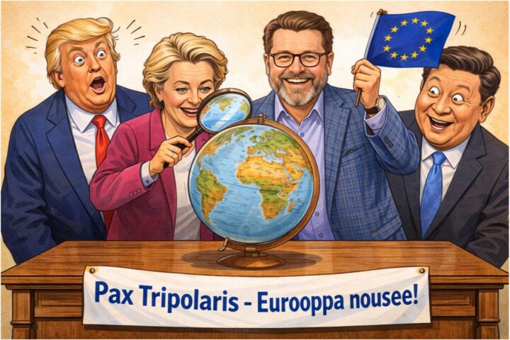 Kolminapaisessa maailmassa Eurooppa nousee suurvallaksi USA:n ja Kiinan rinnalle. Venäjä hajoaa ja taantuu sekä menettää vaikutusvaltaansa maailmassa. Kehitystä pohtivat kuvassa Yhdysvaltain Donald Trump, EU:n Ursula von der Leyen, Helsingin Matti Niiranen ja Kiinan Xi Jinping. KUVA Chat GPT